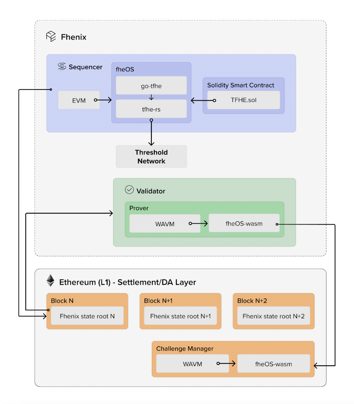 Fhenix uses an Optimistic Rollup structure to avoid the computational overhead associated with FHE. Since Ethereum does not natively support FHE, Fhenix utilizes the Arbitrum Nitro* prover to enable the FHE logic to be compiled and run on WASM (WebAssembly) code. This prover is the key component responsible for generating fraud proofs used to validate the correctness of off-chain computations and transactions. By compiling the FHE logic into WASM code, the prover can efficiently execute the necessary computations and generate fraud proofs when required.